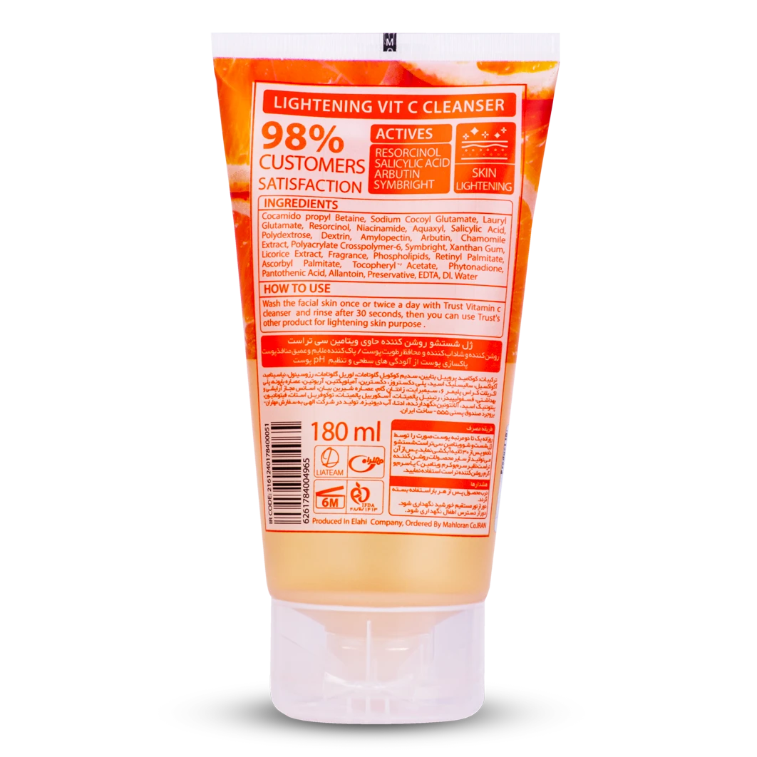 ژل شستشو روشنکننده حاوی ویتامین سی تراست به خاطر داشتن مواد مؤثره ویتامین سی، رزورسینول، سالیسیلیک اسید، آربوتین و سیم برایت، پوست را روشن و شاداب ساخته و از آن محافظت میکند. همچنین این محصول یک پاککننده ملایم و عمیق منافذ پوستی بوده و پوست را از آلودگیهای سطحی پاکسازی کرده و میزان pH پوست را تنظیم میکند.