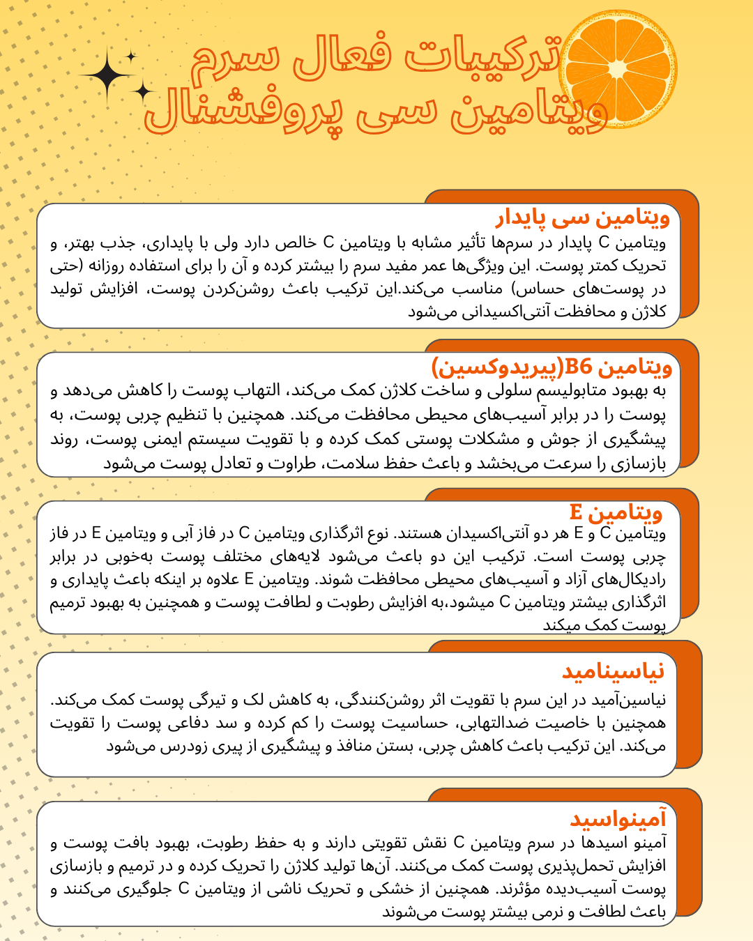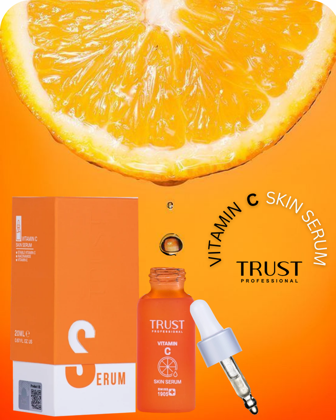 سرم ویتامین سی تراست با داشتن ترکیبات مؤثر در ساختار خود، جدای از مراقبت از پوست، با توان «روشنکنندگی قدرتمندی» که دارد، پوستی روشن، درخشان، باطراوت و با نشاط به شما میبخشد. ویتامین سی پایدار موجود در این سرم، از پوست در برابر عوامل آسیبرسان محافظت کرده، پوست را بازسازی و احیا کرده (جوانسازی پوست) و تولید کلاژن در پوست را افزایش میدهد و با این کار از بروز چینوچروک در پوست جلوگیری میکند. ماده مؤثره نیاسینامید در این سرم هم با رادیکالهای آزاد مبارزه کرده و لایه محافظ پوست را تقویت میکند. همچنین این محصول با داشتن ویتامین ای در ترکیبات خود از پیری زودرس پیشگیری کرده، رطوبت پوست را حفظ کرده و خاصیت کشسانی پوست را بهبود میبخشد.