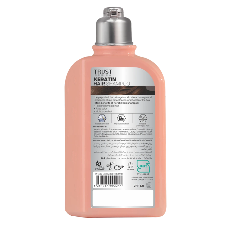 شامپو سر کراتین تراست، با دارا بودن کراتین و ویتامین E، با نرم کردن مو و کمک به استحکام ساختاری آن، مانع از شکستگی و آسیب تارهای مو میشود. این شامپو ضمن رفع وزی تارهای مو، به تثبیت رنگ، ترمیم و افزایش ضخامت مو کمک میکند.