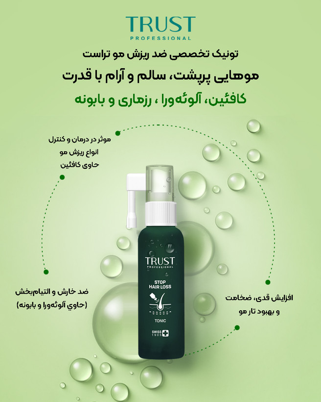 این محصول قابل استفاده بر هر دو الگوی ریزش موی زنانه و مردانه بوده و همچنین مکانیزم اثر بخشی محصول به گونهای است که پس از قطع مصرف عوارض محصولات حاوی ماینوکسیدیل را ندارد. همچنین اکتیوهای تخصصی تونیک تراست باعث بهبود گردش خون در پوست سر شده و شرایط مناسبی برای تغذیه کافی ریشه مو فراهم کرده و موجب تحریک گردش خون مویرگی و تحریک رشد موی سر میشود. ویتامینهای مورد مصرف در تونیک تراست نیز اثرات منحصربهفردی در فولیکول و تار مو دارد؛