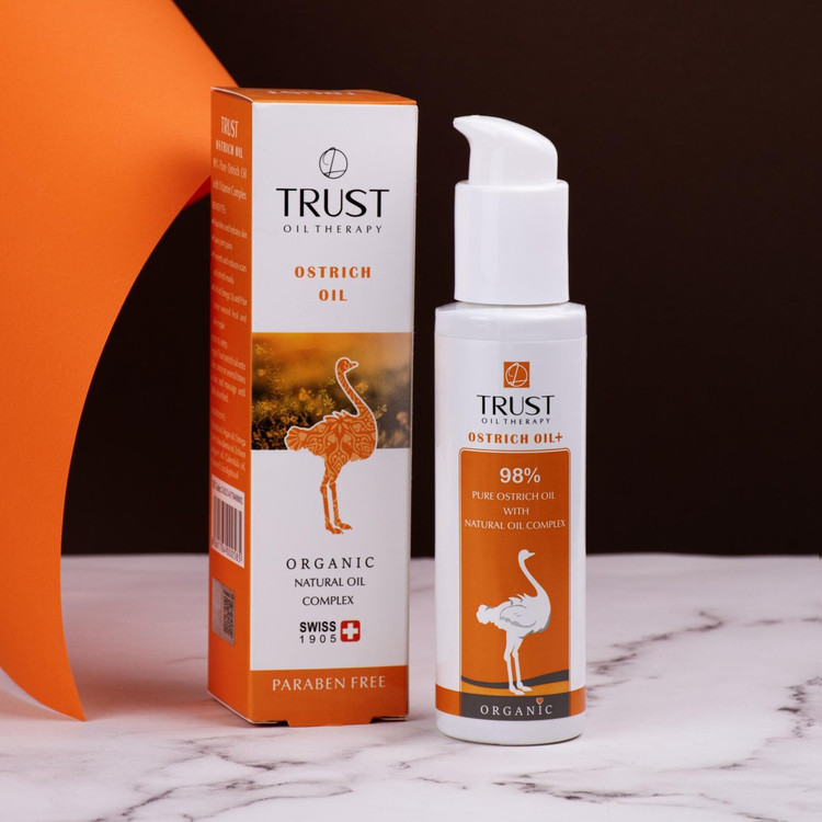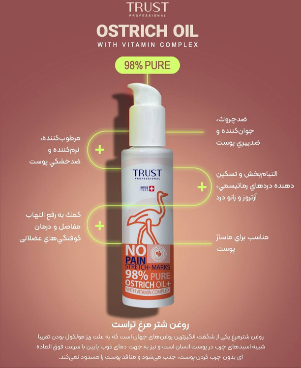 روغن شترمرغ تراست حاوی ۹۸درصد روغن شترمرغ خالص +ویتامین های مورد نیاز پوست وامگا۳،زود جذب و بدون بو