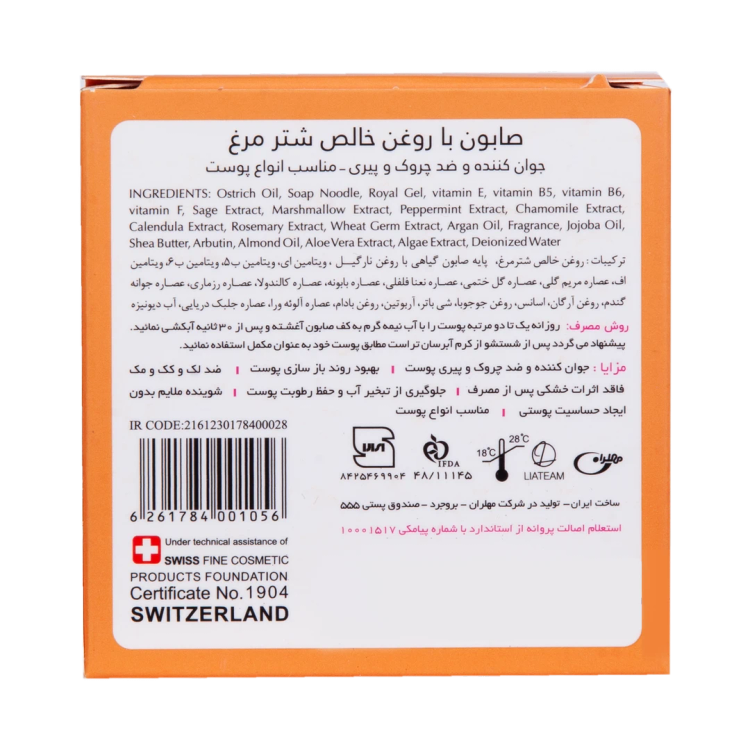 عصاره شترمرغ، روغن آووکادو، روغن نارگیل، روغن زیتون، روغن جوجوبا، روغن بادام، روغن جوانه گندم، روغن کالندولا، شی باتر