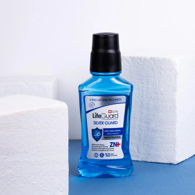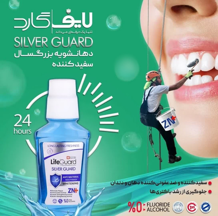 و در نهایت، مهمترین ویژگی دهانشویه بزرگسال (Silver Guard) برند لایف گارد، تأثیر بسزایی است که در سفیدکنندگی دندانها دارد. علاوه بر این ویژگی، به واسطه اکتیوهای خاص آنتی میکروبیال، در تمیز کردن حفره دهانی و پیشگیری از پوسیدگی دندانها نقش داشته و در استحکام دندانها بسیار تأثیرگذار است؛ این محصول، از بوی بد دهان پیشگیری کرده و جلوی تشکیل پلاک را نیز میگیرد. با این محصول، لبخندی درخشان را تجربه کنید، طعم خنکی و تازگی را بچشید و از سلامت حفره دهانیتان اطمینان حاصل کنید.