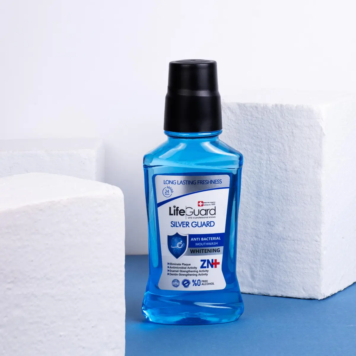 دهانشویه بزرگسال سفیدکننده (Silver Guard) برند لایف گارد بهداشت دهان و در حجم 270 میلیلیتر طراحی و تولید شده است؛ این دهانشویه، ویژگیهای منحصربهفردی دارد که به دهان شما حس و حال تازگی بخشیده و درخشش بینظیری را برای لبخند شما به همراه میآورد.