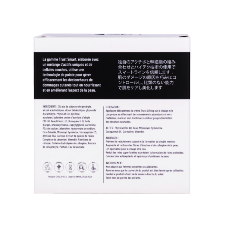پس از شستشوی پوست، کرم لیفتینگ پوست تراست اسمارت را صبح و شب روی پوست صورت و گردن به آرامی و به سمت بالا و بیرون ماساژ دهید. استفاده از کرم را تا نتیجه دلخواه ادامه دهید.